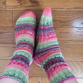 でもね・・・こういった万人に合うデザインってどこかブカブカしていたりして、やっぱり踵のある靴下の方が良いよね~ってなりがちなんですが、これはそうでもないです。問題は足首の甲側がダボつくってことなんですけれど、これはその問題を甲側のゴム編みの横バージョン(技法の名前を知らないんです~)が解決してくれました。