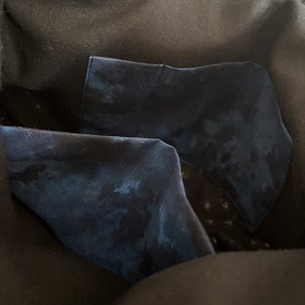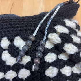 内布は黒ベースに青のむら染めでポケットを。持ち手はウッドビーズの黒を付けました。